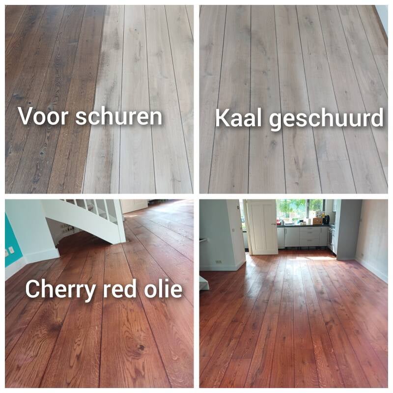 deze prachtige compleet verlijmde eiken vloer geschuurd en behandelt met een 2 componentenolie in de kleur Cherry Red.